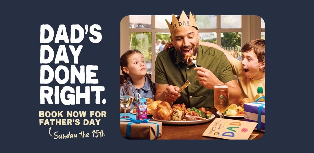 We LOVE families at Farmhouse Inns, so pull up a chair– we've got space for everyone! Whether you pop in for a Father's Day lunch or book a table for Father's Day dinner, you'll have a great time here, with our selection of premium beers, wines, and spirits, an ice cream cabinet with all your favourite flavours, and even indoor and outdoor play areas for kids.